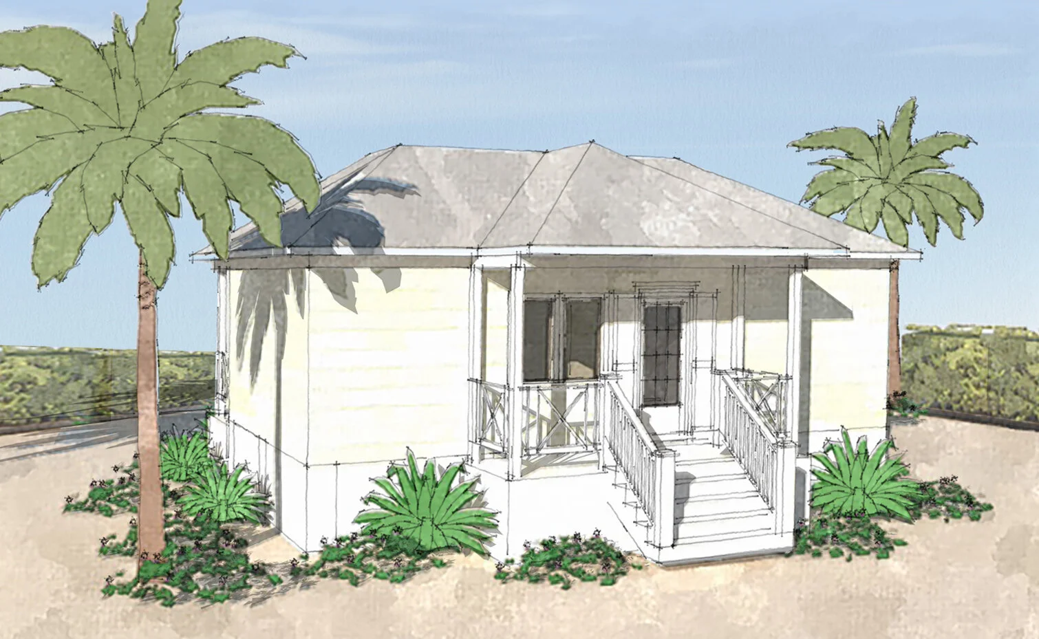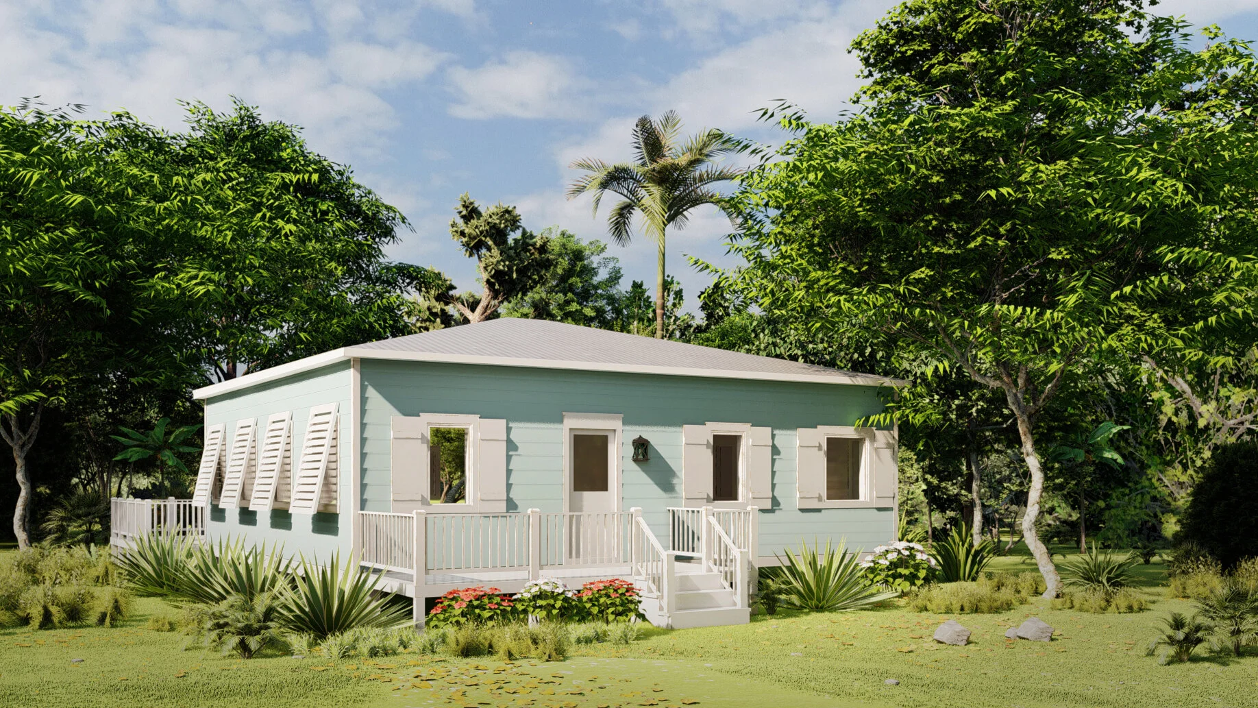 A one-bedroom cottage and a studio linked by breezeways by Mosaic Building Systems using corrosion- and water-resistant materials. Raised on concrete pile foundations by ABC Construction and a Bermuda Roof by Paint Fair, Grand Bahama.