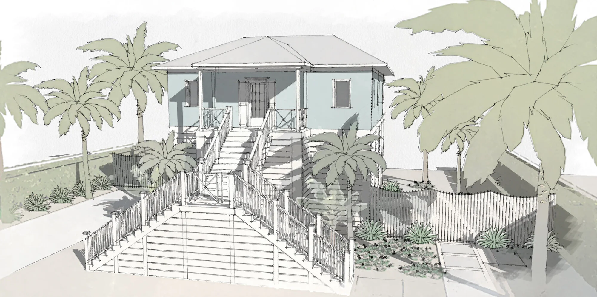 At Mosaic we highly recommend a raised foundation, especially for those building in low lying areas. Shutters or breakaway walls, hiding the pilings, create an option to utilize the space below as extra living space, whilst still maintaining structural integrity and strength in a hurricane.