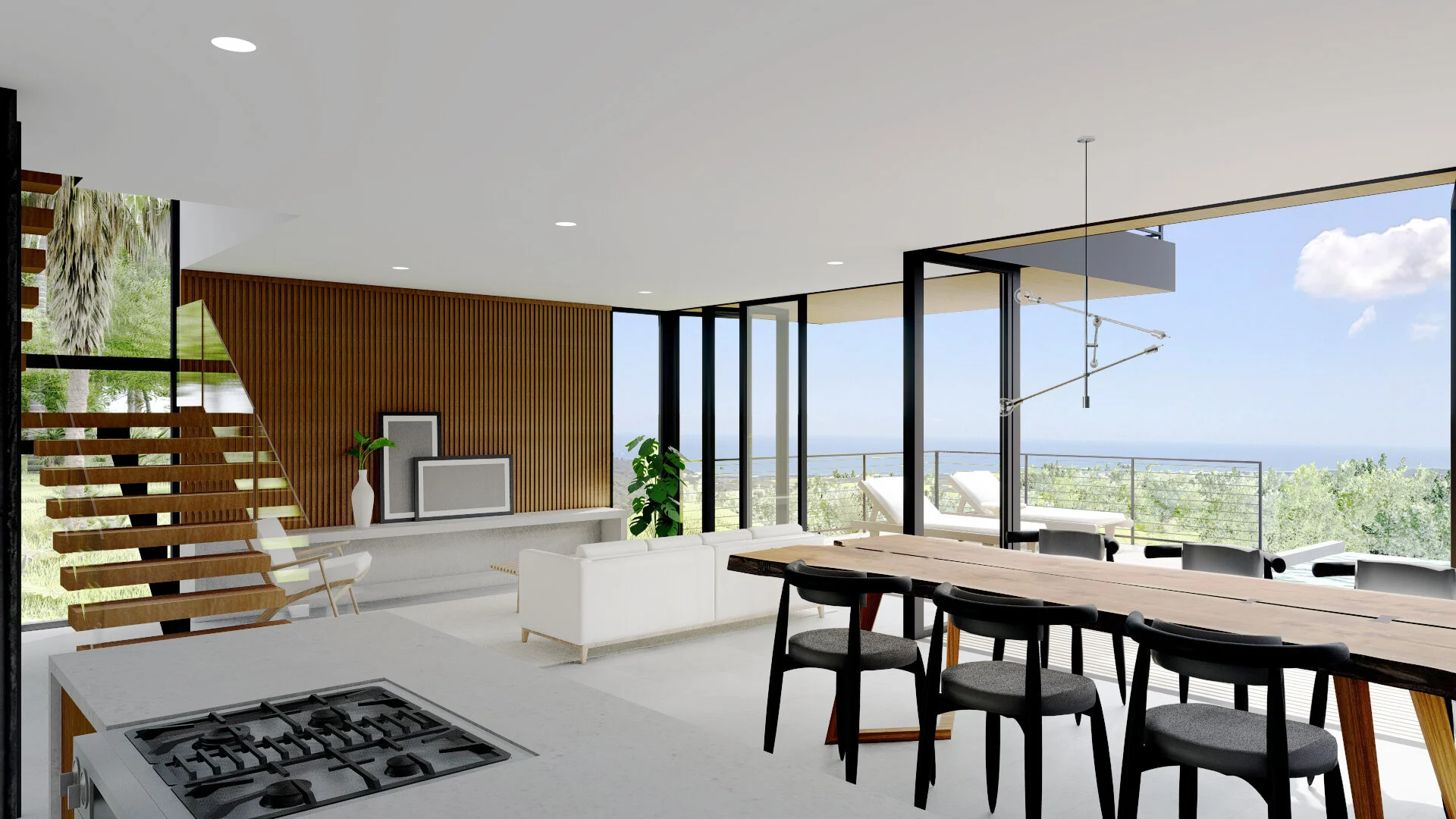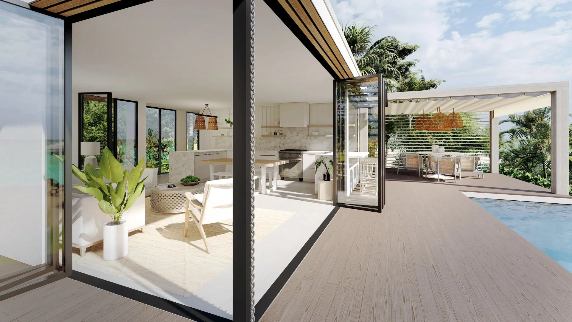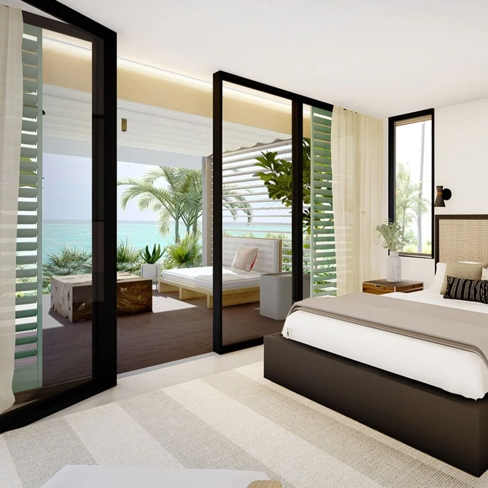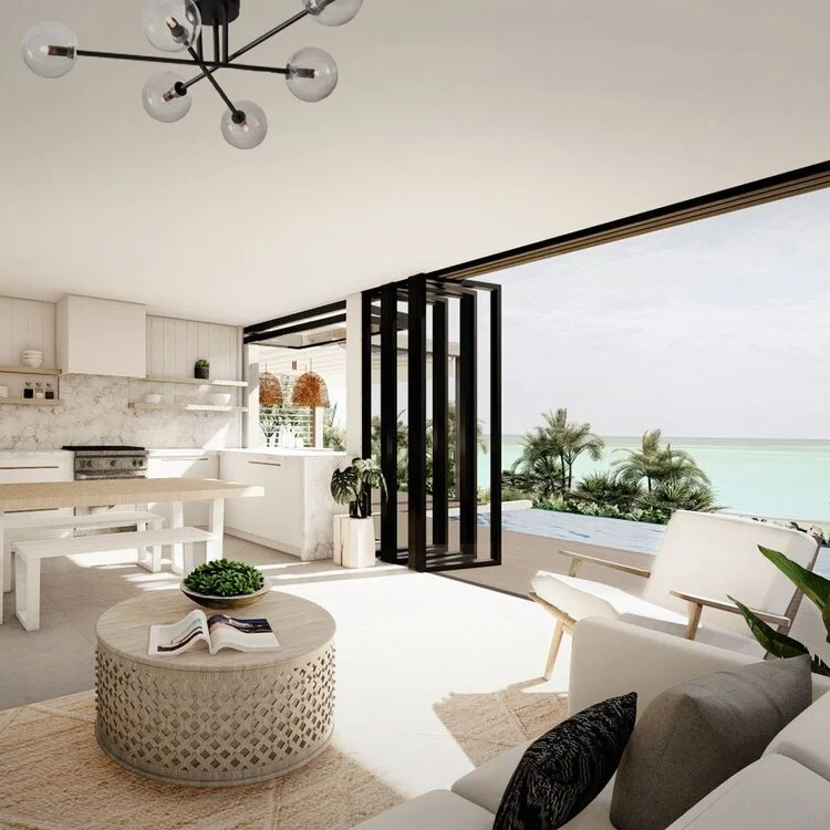 A fun, contemporary house promoting indoor / outdoor living. The kitchen, dining and living areas extend out to the terrace with an open-sided bar added for good measure. Hurricane-resistant windows can be pulled back to enhance the experience of the inside blending with the wonderful open air. The layout can also be adapted to allow for more bedrooms.