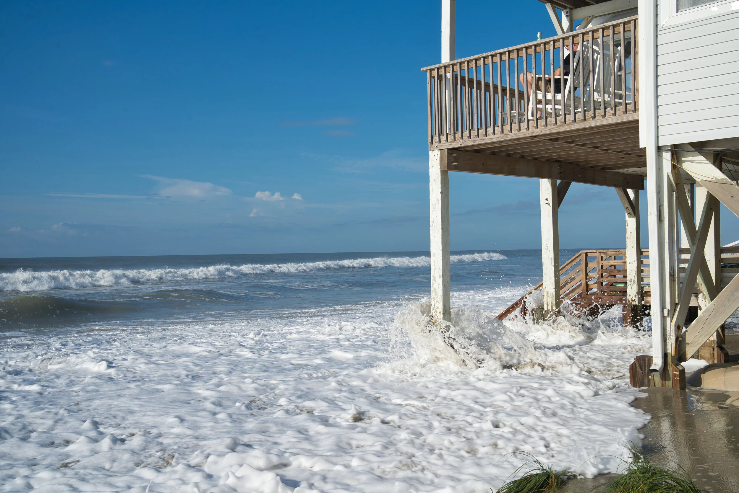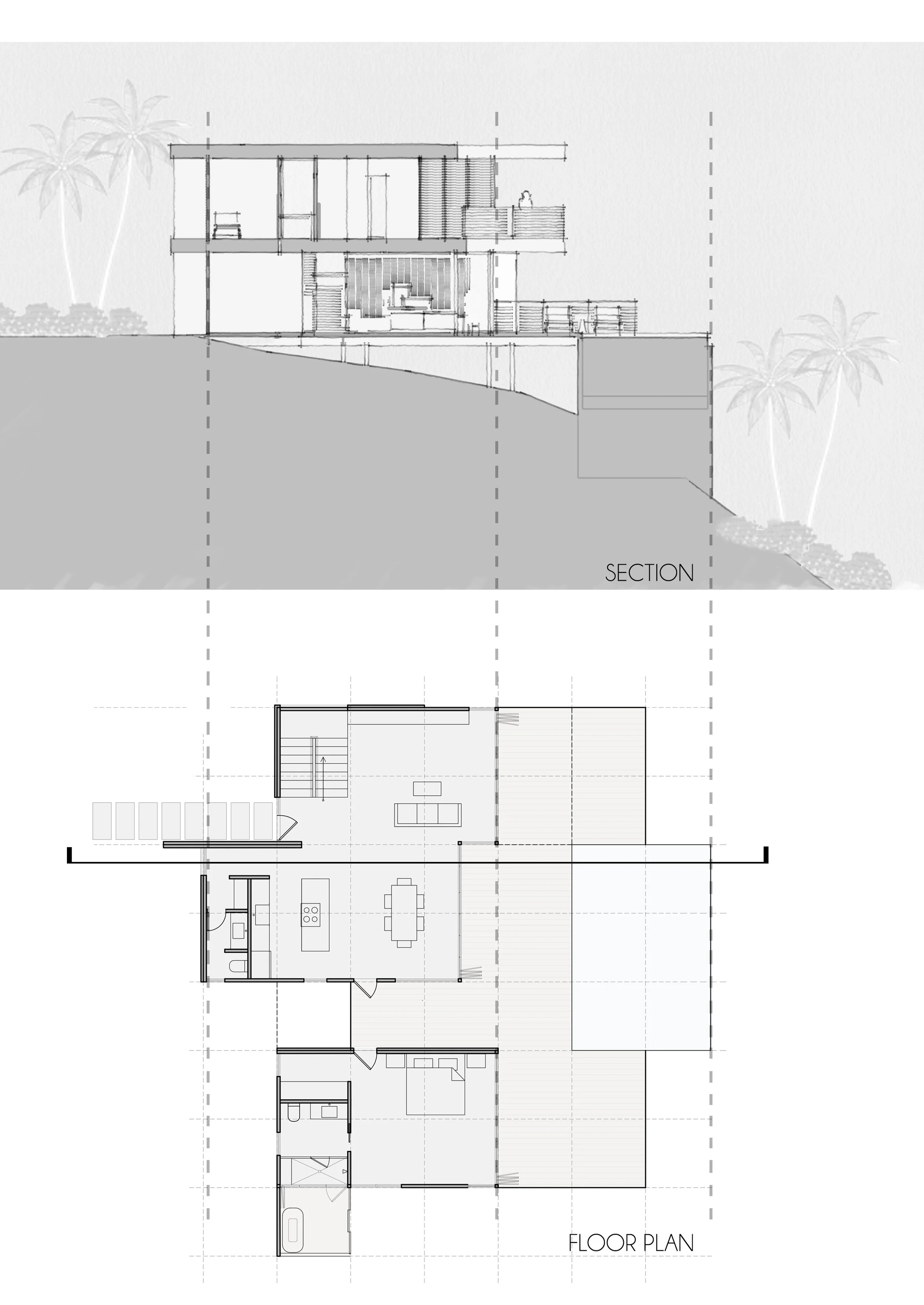 Raised living space on two floors. In case a hurricane strikes or flooding is a threat, the wall panels can be removed on the ground floor to allow throughflow of flood water.