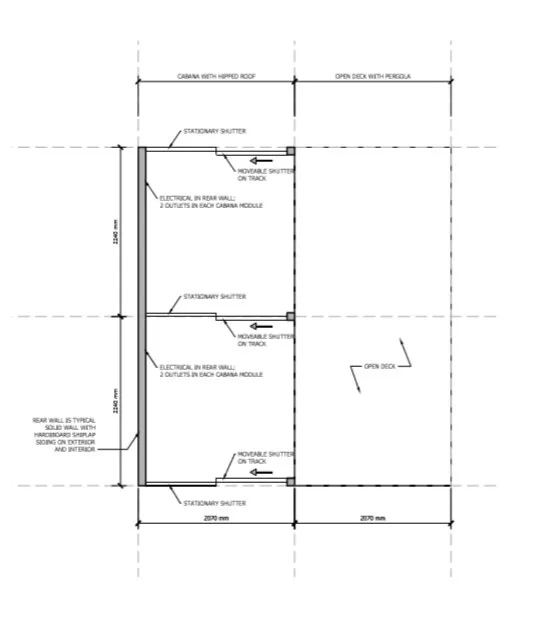 Floorplan for a TWO bedroom 900 Sq. ft house consisting of 15 Modules with bifold window doors with outdoor deck.